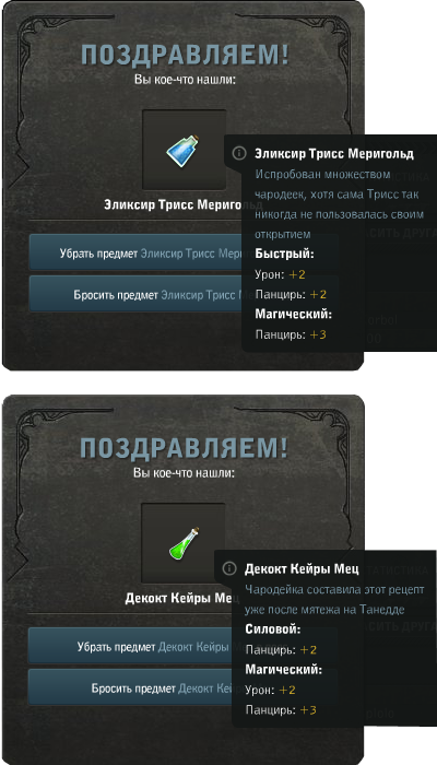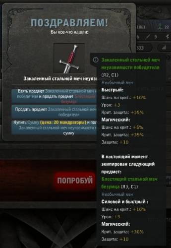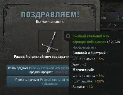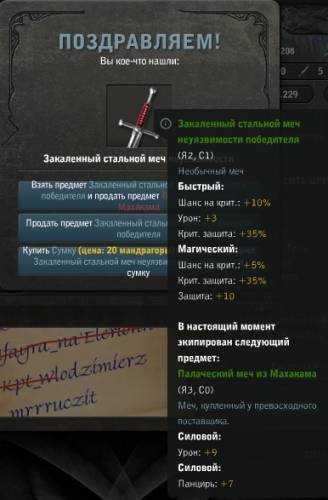 | Бой длился недолго, ведьмак парой легких ударов нанес смертельные раны противнику. Бой окончен. Очередной бой в долгой череде ему подобных приближающих его к верхушке рейтинга. Но было в нем что-то не так, маленькая вещь которая выделяла его как и некоторые прошедшие бои, это был трофей найденый на арене! В данной теме предлагаю выкладывать скришноты вещей найденых как в путишествиях так и в боях. Закаленный стальной меч неуязвимости победителя (найден в битве) [Ведьмак] Бурое масло (куплено у торгвца в долине Каэр Морхена) [Химера]